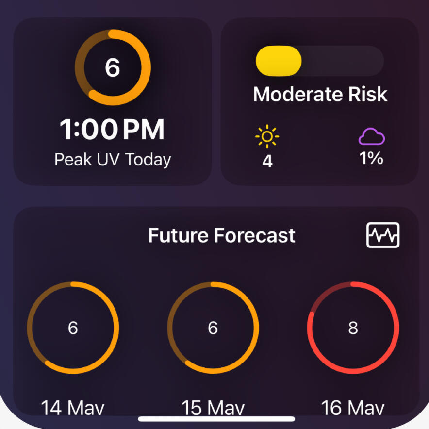 The app also offers more features such as risk (taking in cloud cover to give deeper insight). Peak UV hours for the day alongside future forecasts for your location and your saved locations.
